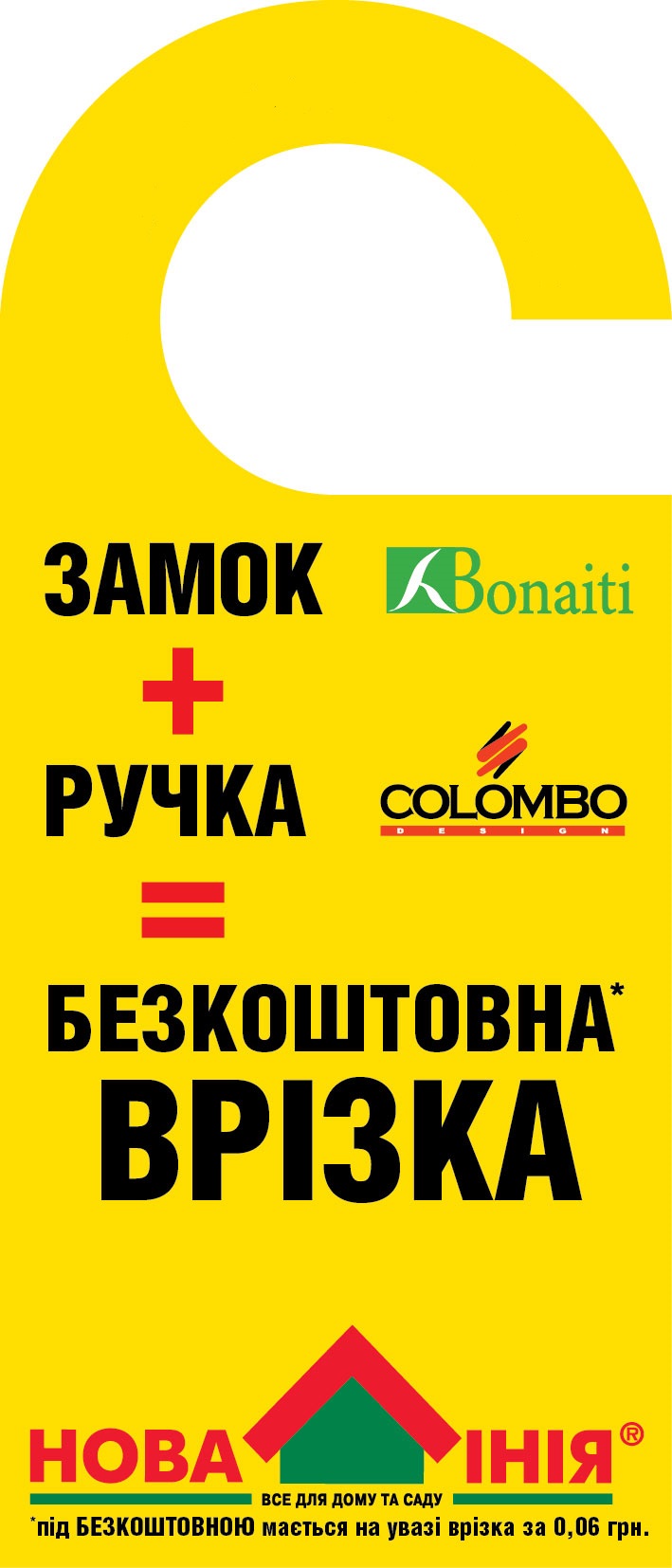 Только в сети магазинов "Новая Линия" до 31.08.2014 действует специальная акция. Все покупатели комплекта дверная ручка Colombo + механизм Bonaiti получают возможность воспользоваться услугой врезки замка в дверное полотно всего за 0,06 грн.