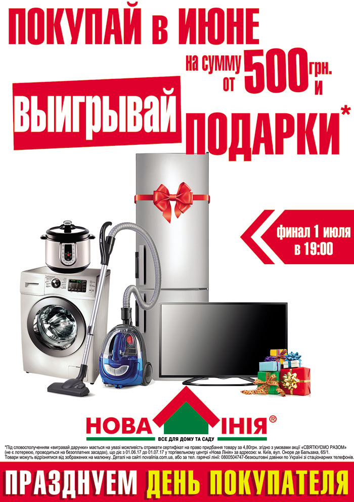 В честь празднования Дня Покупателя Новая Линия, расположенная по адресу: г. Киев, ул. Оноре де Бальзака, 65/1, приготовила для Вас подарки!